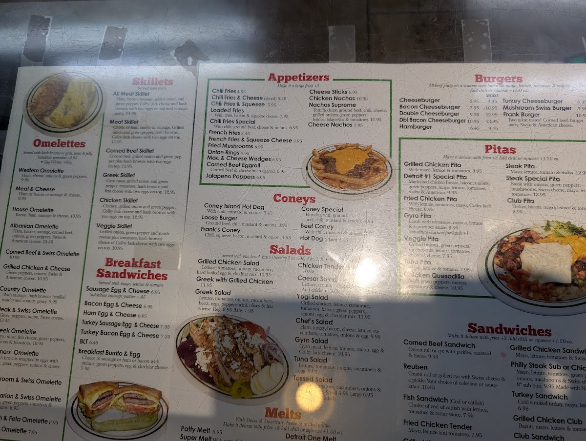For those seeking variety, the menu extends beyond traditional Coney delights. You can savor the hearty Albanian Omelette, brimming with ham, bacon, sausage, and corned beef, topped with melted cheeses—an absolute must-try for breakfast enthusiasts.
